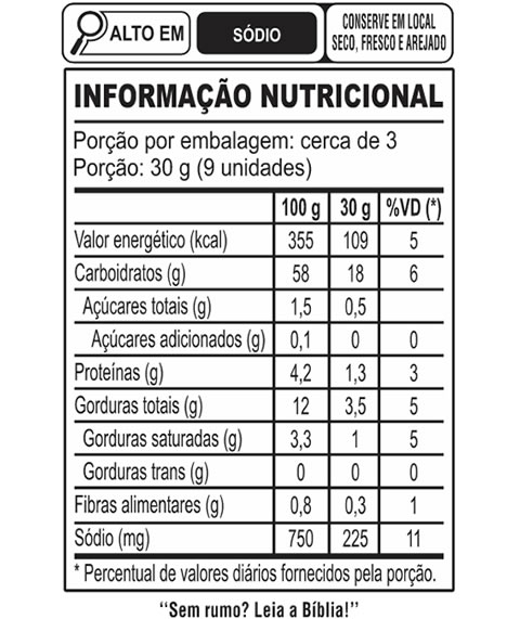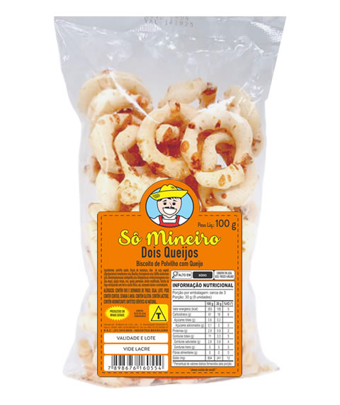 polvilho azedo, fécula de mandioca, óleo de soja vegetal (Agrobacterium tumefaciens e/ou Bacillus thuringiensis e/ou Delftia acidovoran e/ou Stenotrophomonas maltophilia e/ou Streptomyces viridochromogenes e/ou Zea mays), queijo minas, ovo, queijo parmesão, amido modificado, farinha de trigo enriquecida com ferro e ácido fólico, sal, composto lácteo e aromatizante.